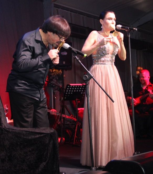 Dekolte bir kıyafeti tercih eden ve konserinde mini şovlar da yapan sanatçı, orkestrasında bulunan yıllar önce Grup Laçin’den tanıdığımız perküsyon sanatçısı Teoman Dalcı ile de kaşık şov yaptı.