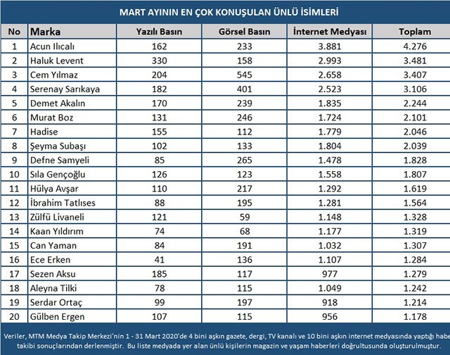 Yarışma programında Türkiye’deki sağlık çalışanlarına alkışlı destek de veren Acun Ilıcalı ay boyunca 4 bin 276 haberde yer alarak Mart ayında da zirvedeki yerini korudu.