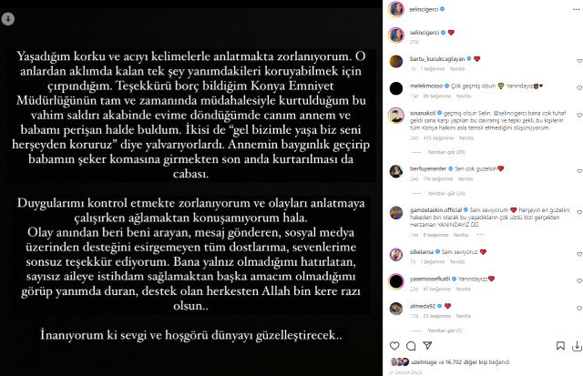 “Duygularımı kontrol etmekte zorlanıyorum ve olayları anlatmaya çalışırken ağlamaktan konuşamıyorum hala. Olay anından beri beni arayan, mesaj gönderen, sosyal medya üzerinden desteğini esirgemeyen tüm dostlarıma, sevenlerime sonsuz teşekkür ediyorum.