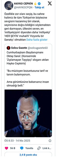 Görüntülerin yayılmasının ardından Cumhurbaşkanı Başdanışmanı Oktay Saral, sosyal medya platformu X (Twitter) üzerinden yaptığı paylaşımda Hayko Cepkin’i hedef aldı.
