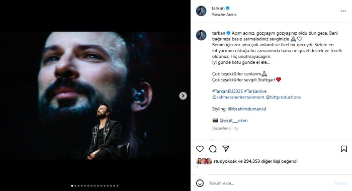 “GÖZYAŞIM GÖZYAŞINIZ OLDU” Tarkan, konser sonrası duygularını sosyal medya hesabından anlattı: “Acım acınız, gözyaşım gözyaşınız oldu dün gece. Beni bağrınıza basıp sarmaladınız sevginizle ?????? Benim için zor ama çok anlamlı ve özel bir geceydi. Sizlere en ihtiyacımın olduğu bu zamanımda bana ne güzel destek ve teselli oldunuz. Hiç unutmayacağım. İyi günde kötü günde el ele… Çok teşekkürler canlarım Çok teşekkürler sevgili Stuttgart”