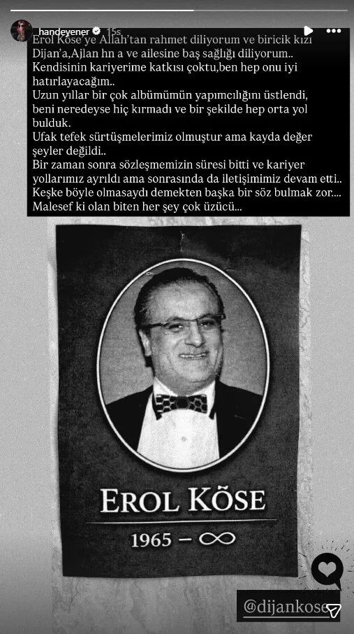 Hande Yener, 61 yaşında hayatını kaybeden Erol Köse ile ilgili bir paylaşımda bulundu. “OLAN BİTEN HER ŞEY ÇOK ÜZÜCÜ” Yener, sosyal medya hesabından yaptığı paylaşımda, Erol Köse’nin vefatına ilişkin şunları kaydetti: “Erol Köse’ye Allah’tan rahmet diliyorum ve biricik kızı Dijan’a, Ajlan hanıma ve ailesine baş sağlığı diliyorum. Kendisinin kariyerime katkısı çoktu, ben hep onu iyi hatırlayacağım. Uzun yıllar birçok albümümün yapımcılığını üstlendi, beni neredeyse hiç kırmadı ve bir şekilde hep orta yol bulduk. Ufak tefek sürtüşmelerimiz olmuştur ama kayda değer şeyler değildi. Bir zaman sonra sözleşmemizin süresi bitti ve kariyer yollarımız ayrıldı ama sonrasında da iletişimimiz devam etti. Keşke böyle olmasaydı demekten başka bir söz bulmak zor. Maalesef ki olan biten her şey çok üzücü...” Hande Yener, Erol Köse için dün Zincirlikuyu Camii’nde düzenlenen cenaze törenine de katılmıştı.