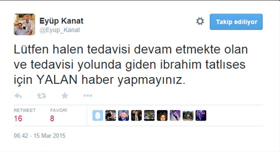 İbrahim Tatlıses'in ameliyat olduğu günden bu yana sosyal medyada sessizliğini koruyan, İbrahim Tatlıses'in sağlık durumu hakkında kesin bir bilgi alınamadığı için hakkında çıkan haberler için menajer Eyüp Kanat; 'Lütfen halen tedavisi devam etmekte olan ve tedavisi yolunda giden İbrahim Tatlıses için YALAN haber yapmayınız.' dedi.
