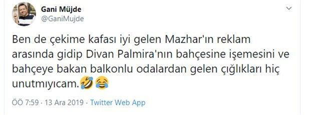 “Ben de çekime kafası iyi gelen Mazhar’ın reklam arasında gidip Divan Palmira’nın bahçesine işemesini ve bahçeye bakan balkonlu odalardan gelen çığlıkları hiç unutmıyıcam.”