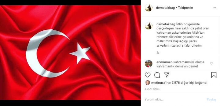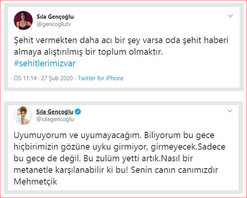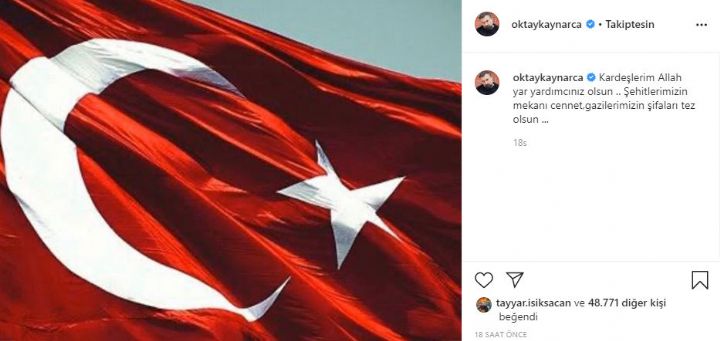 “Bu mübarek gecede, dualarımız Mehmetçiklerimizle... Yarın yayınımız tabi ki yok, boş beleş şeyler paylaşanlar önce Mehmetciğimize, ailelerine dua etsin. Dualarımız sizinle kahraman ordumuzla”