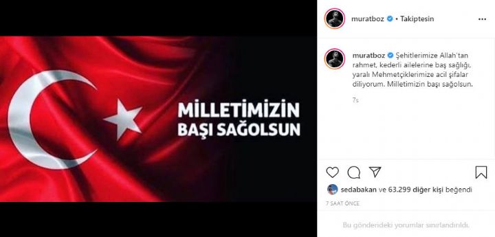 “Başımız sağ olsun. Şehitlerimize Allah’tan rahmet, yaralılarımıza acil şifalar dilerim. Allah tüm milletimize sabır versin.”