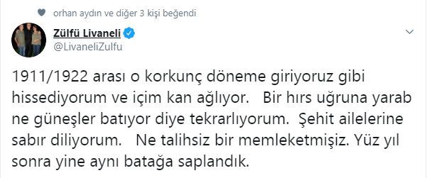 “Başımız sağ olsun diyecek hiçbir şey bulamıyorum... Şehit olan mehmetçiklerimize baş sağlığı yakınlarına büyük sabır diliyorum.”