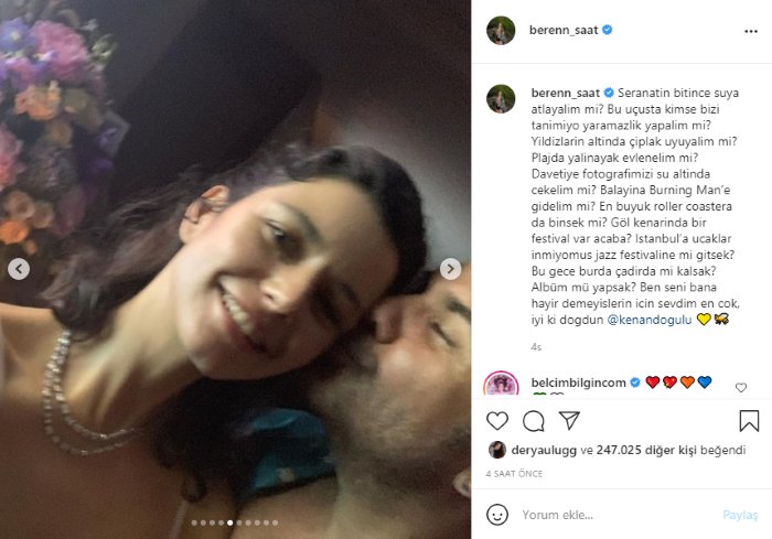 Güzel oyuncu, “Seranatın bitince suya atlayalım mı? Bu uçuşta kimse bizi tanımıyorken yaramazlık yapalım mı? Yıldızların altında çıplak uyuyalım mı? Balayına Burning Man’e gidelim mi? Albüm mü yapsak? Ben seni bana hayır demediğin için çok sevdim. İyi ki doğdun aşkım...” ifadelerini kullandı.