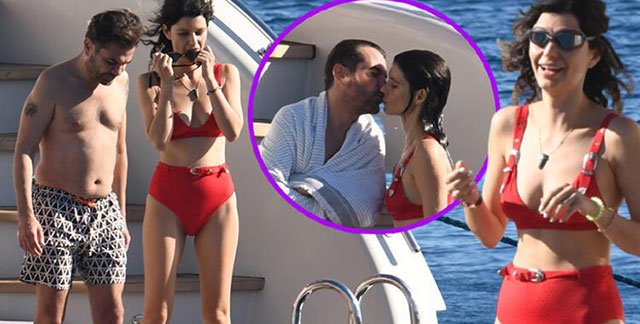 Kısa süren deniz keyfinin ardından sudan çıkan Doğulu, havlusuna sarıldığı sırada teknenin merdivenlerinden çıkan eşine sarılarak öptü.