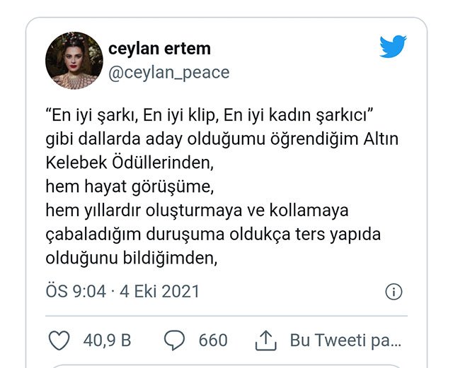 “‘En iyi şarkı, En iyi klip, En iyi kadın şarkıcı’ gibi dallarda aday olduğumu öğrendiğim Altın Kelebek Ödülleri’nden, hem hayat görüşüme, hem yıllardır oluşturmaya ve kollamaya çabaladığım duruşuma oldukça ters yapıda olduğunu bildiğimden Hürriyet Gazetesinin (ve bu tür gerçekliği sisli olan yarışmaların) temsil ettikleri ve etmedikleri sebepleriyle, bir çok müzisyen arkadaşım ve sanatçı ustalarım gibi, ben de çekiliyorum.