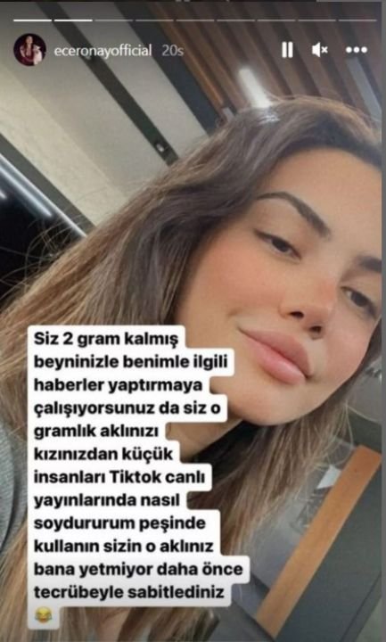 Ronay hızını alamayınca bir paylaşım daha yaparak “Siz 2 gram kalmış beyninizle benimle ilgili haberle yaptırmaya çalışıyorsunuz da siz o gramlık aklınız kızınızdan küçük insanları Tiktok canlı yayınlarında nasıl soydururum peşinde kullanın. Sizin o aklınız bana yetmiyor” dedi.