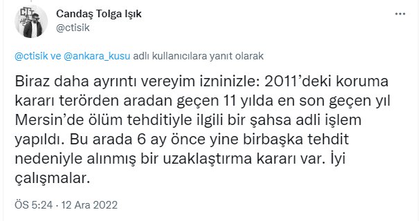 “Biraz daha ayrıntı vereyim izninizle: 2011’deki koruma kararı terörden aradan geçen 11 yılda en son geçen yıl Mersin’de ölüm tehdidiyle ilgili bir şahsa adli işlem yapıldı. Bu arada 6 ay önce yine bir başka tehdit nedeniyle alınmış bir uzaklaştırma kararı var. İyi çalışmalar.”