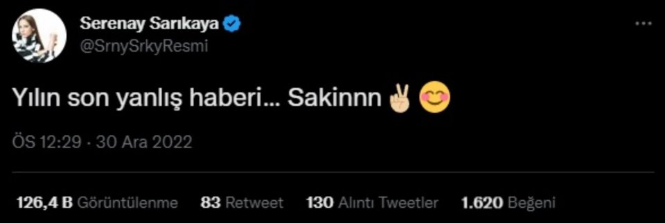 Kısa sürede gündem olan aşk iddiasının ardından Twitter hesabından paylaşım yapan ünlü oyuncu, “Yılın son yanlış haberi, sakin” ifadelerini kullandı.