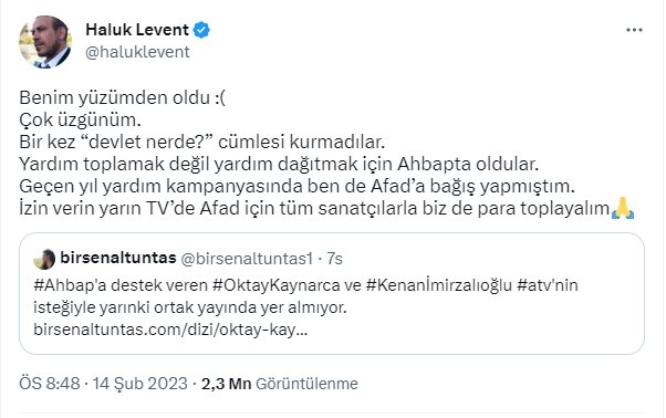 “Benim yüzümden oldu. Bir kez, ’Devlet nerede?’ cümlesi kurmadılar. Yardım toplamak için değil, yardım dağıtmak için AHBAP’ta oldular. İzin verin yarın TV’de AFAD için tüm sanatçılarla biz de para toplayalım” dedi.