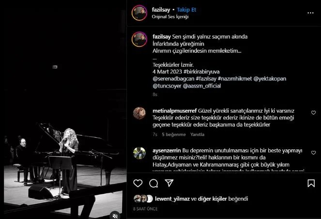 Haberler Fazıl Say ile Serenad Bağcan, İzmir Büyükşehir Belediyesi tarafından Kahramanmaraş merkezli 7,7 ve 7,6 büyüklüğündeki depremlerden etkilenenler için başlatılan ‘Bir Kira Bir Yuva’ kampanyası kapsamında Ahmed Adnan Saygun Sanat Merkezi’nde düzenlenen konserde seyirciyle bir araya geldi.
