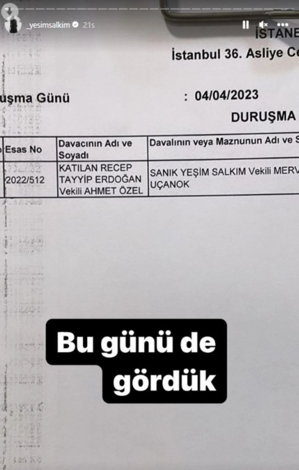 Sosyal medya hesabından İstanbul 36’ıncı Asliye Ceza Mahkemesi’nde görülen duruşmanın listesini paylaşan Yeşim Salkım, “Evet, bunu da gördük” diyerek tepki gösterdi.