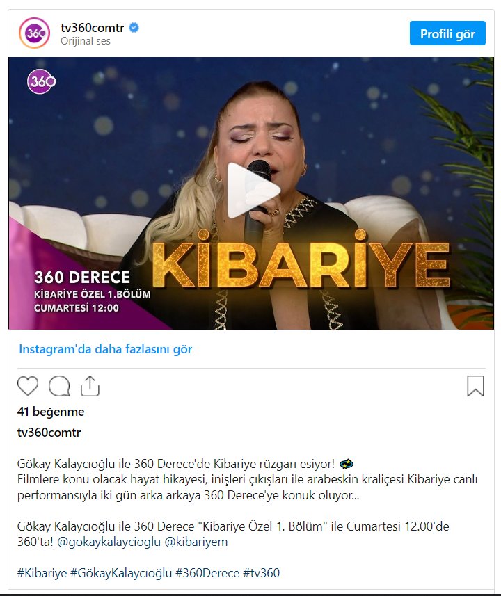 Filmlere konu olacak hayat hikayesi, inişleri çıkışları ile arabeskin kraliçesi Kibariye canlı performansıyla iki gün arka arkaya 360 Derece’ye konuk oluyor... Kibariye hayat hikayesinde birbirinden ilginç olaylar anlattı. 12 yaşında tecavüz girişimine uğradığını, babasını hiç affetmediğini, annesinin ilk kocası ile ilgili haklı olduğunu, ikinci eşi Ali’nin ona abla dediğini kah gülerek, kah ağlayarak anlatan Kibariye film gibi bir hayat hikayesi dedirtti.