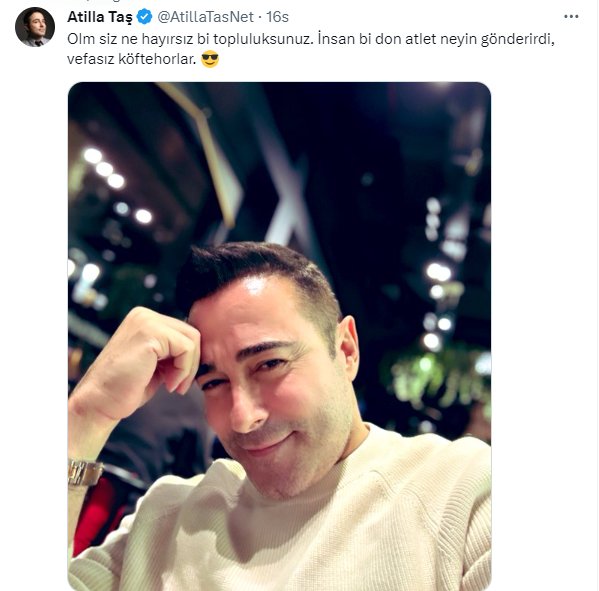Eşiyle gittiği Beşiktaş’taki bir eğlence mekanında çıkan kavga üzerine olay yerine gelen ekiplere de zorluk çıkardığı için polise mukavemet suçundan tutuklanan Atilla Taş, tahliye edildi. Serbest kaldıktan sonra takipçilerine sitem eden Taş, “İnsan bir don atlet neyin gönderirdi” ifadelerini kullandı. SİTEM ETTİ Sosyal medya hesabından fotoğrafını paylaşarak takipçilerine sitem eden Atilla Taş, şu ifadelerini kullandı. “Olum siz ne hayırsız bir topluluksunuz. İnsan bir don atlet neyin gönderirdi, vefasız köftehorlar”