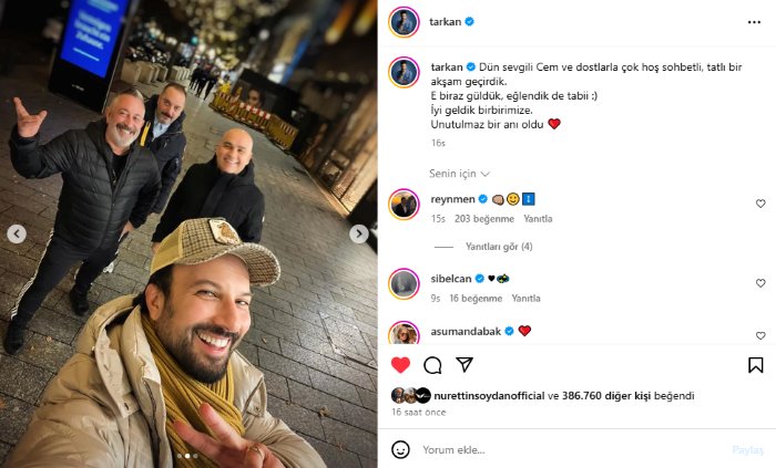 Tarkan, paylaşımında "Dün sevgili Cem ve dostlarla çok hoş sohbetli, tatlı bir akşam geçirdik" notunu düştü. E biraz güldük, eğlendik de tabii :) İyi geldik birbirimize. Unutulmaz bir anı oldu" dedi.