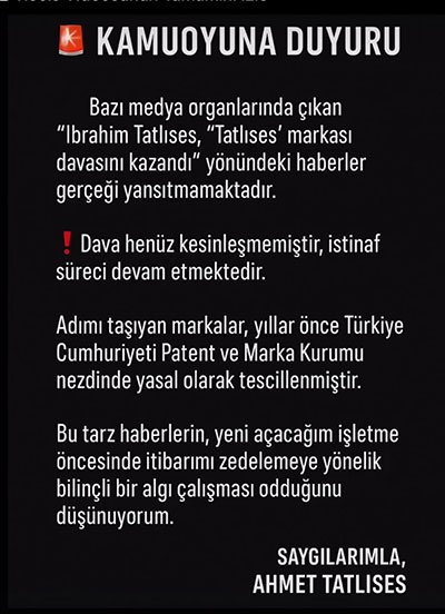 Ticari ilişkilerine zarar verilmesi açısından bu tarz haberlerin kasıtlı olarak çıkarıldığını söyleyen Ahmet Tatlıses davanın İstinaf’a gittiğini ve henüz neticelenmediğini söyledi DurakMedya’dan Mustafa Barış Durak’ın haberine göre İbrahim Tatlıses ile oğlu Ahmet Tatlıses cephesinde sular durulmuyor. Ahmet Tatlıses, babası ile halen devam eden davasının olduğunu söyleyerek şöyle açıklama yaptı: “Bazı medya organlarında “İbrahim Tatlıses, ‘Tatlıses’ markasını izinsiz kullandığı gerekçesiyle oğluna açtığı davayı kazandı” şeklinde çıkan haberler gerçeği yansıtmamaktadır. Söz konusu dava hâlâ istinaf aşamasındadır ve henüz kesinleşmiş bir karar bulunmamaktadır. Ben, Ahmet Tatlıses, adımı taşıyan markaları yıllar önce Türkiye Cumhuriyeti Patent ve Marka Kurumu nezdinde yasal olarak tescil ettirdim. Tüm ticari faaliyetlerim hukuka uygun şekilde yürümektedir. Bu haberlerin, yeni açacağım işletme öncesi bilinçli şekilde servis edildiğini ve ticari itibarımı zedelemeye çalıştığını düşünüyorum. Saygıyla duyurulur.Ahmet Tatlıses”