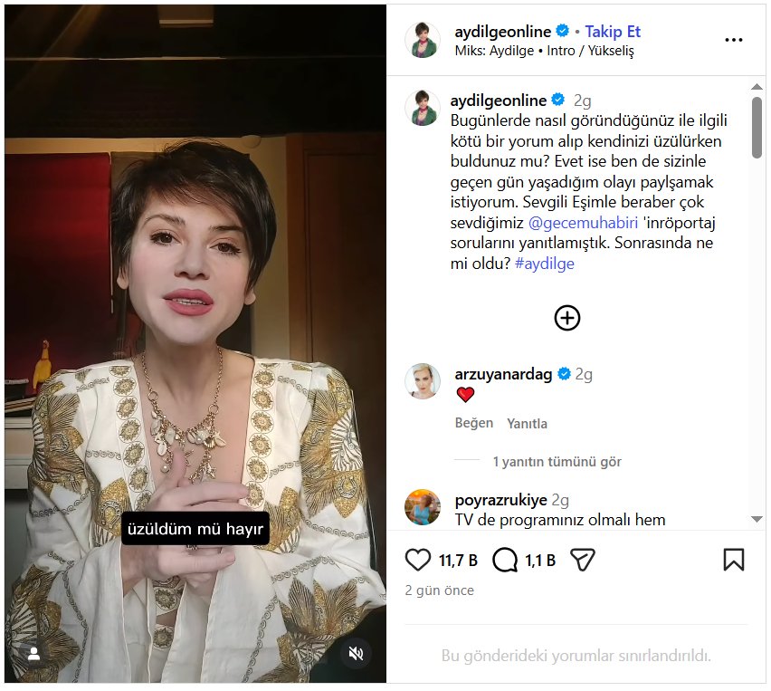 Ünlü şarkıcı Aydilge, sosyal medyada dış görünüşü hakkında yapılan olumsuz yorumlara cevap verdi. Bir hastalığı olduğunu açıklayan ünlü şarkıcı "Kimseye makul bir güzellik borcum yok" dedi. Bazı yorumların dikkatini çektiğini belirten Aydilge, şu ifadeleri kullandı: “Makyajımı iyi yapmadığım, yüzümün çok beyaz olduğuna dair yorumlardı bunlar. Daha önce de başka bir videomda, Harry Potter’daki beyaz suratlı, korkutucu Voldemort’a benzetenler olmuştu. Üzüldüm mü? Hayır ama önceleri çok üzülürdüm. Çünkü ben Vitiligo hastasıyım. Benim yüzümdeki pigmentler ölü ve kimseye makul bir güzellik borcum olmadığı için bazen rengini kendi hâline bırakıyorum.” “ELLERİMDE DE AYNI DURUM VAR” “Bakın, ellerimde de aynı durum var; yarısı beyaz, yarısı daha koyu. Bazen canım isteyince profesyonel makyaj yaptırıyorum, bazen de kendimce bir şeyler yapıyorum. Tabii ki eleştiriler olur, yorumlar yapılır. Benim için hiç sorun değil ama sizleri de üzenlerin çok olduğuna eminim. O yüzden bir kardeş ve abla gibi, şu an sizlere sarılmak istedim. Çünkü sistemin bize dayattığı gerçekçi olmayan ve sürekli değişen güzellik idealleri yüzünden kendi bedenimize yabancılaşıyoruz. Yetmiyor, bir de birbirimize zorbalık yapıyoruz. Estetik yaptıranlar, estetik yaptırdıkları için; yaptırmayanlar ise yaşlı göründükleri için zorbalanıyor. Yani ne yaparsak yapalım, bedenimiz üzerinden sürekli söz sahibi olmaya çalışan bir sistem var.” “PEKİ, NE YAPACAĞIZ?” “Peki, ne yapacağız? Bence kendimizi güzel hissetmek istememiz, beğenilmek istememiz çok doğal ve normal. Ben de istiyorum. Ama ne olur, incindiğimiz yerlerden başkalarını incitmeyelim. Güzel olalım elbette ama güzelliğin ne olduğunu sadece nasıl göründüğümüz üzerine inşa etmeyelim.”