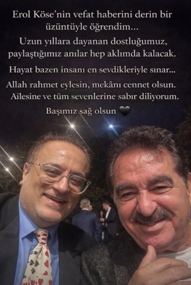 İbrahim Tatlıses, Erol Köse’nin ölümünün ardından bir açıklama yayınladı. Sosyal medya hesabı üzerinden bir paylaşımda bulunan Tatlıses, şunları kaydetti: “PAYLAŞTIĞIMIZ ANILAR HEP AKLIMDA KALACAK” “Erol Köse’nin vefat haberini derin bir üzüntüyle öğrendim... Uzun yıllara dayanan dostluğumuz, paylaştığımız anılar hep aklımda kalacak. Hayat bazen insanı en sevdikleriyle sınar... Allah rahmet eylesin, mekânı cennet olsun. Ailesine ve tüm sevenlerine sabır diliyorum. Başımız sağ olsun”
