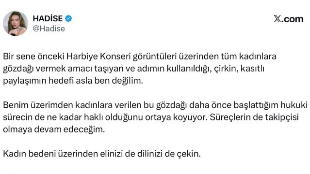 “Bir sene önceki Harbiye Konseri görüntüleri üzerinden tüm kadınlara gözdağı vermek amacı taşıyan ve adımın kullanıldığı, çirkin, kasıtlı paylaşımın hedefi asla ben değilim. Benim üzerimden kadınlara verilen bu gözdağı daha önce başlattığım hukuki sürecin de ne kadar haklı olduğunu ortaya koyuyor.