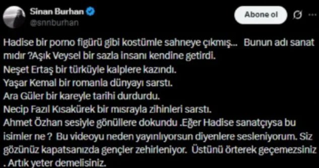 Sinan Burhan, sosyal medya hesabından yaptığı paylaşımında Hadise’nin sahne tarzını sert ifadelerle eleştirerek,